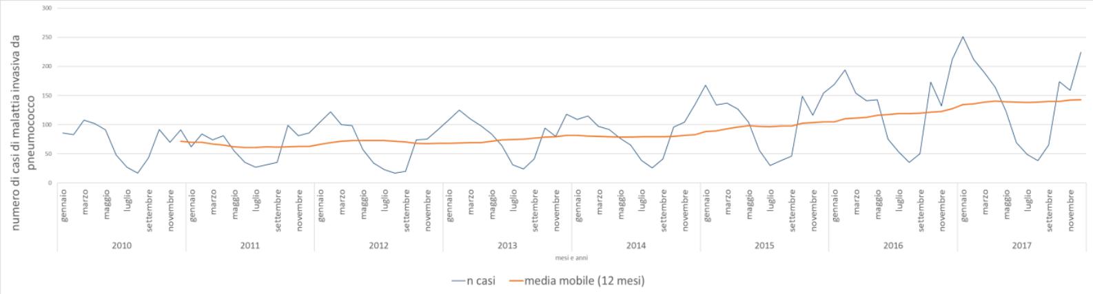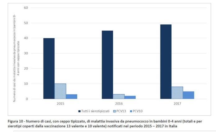 “A partire dal 2015, il numero di casi notificati di malattia invasiva da pneumococco è andato progressivamente aumentando mantenendo un tipico andamento stagionale. In base ai dati disponibili… le malattie invasive da pneumococco in Italia nel periodo di riferimento hanno avuto una incidenza compresa tra 2,07/100 000 abitanti nel 2015 e 2,81/100 000 abitanti nel 2017, inferiore alla media Europea di 5.6 /100 000 abitanti riportata nel 2015 (dato più recente disponibile)”.
